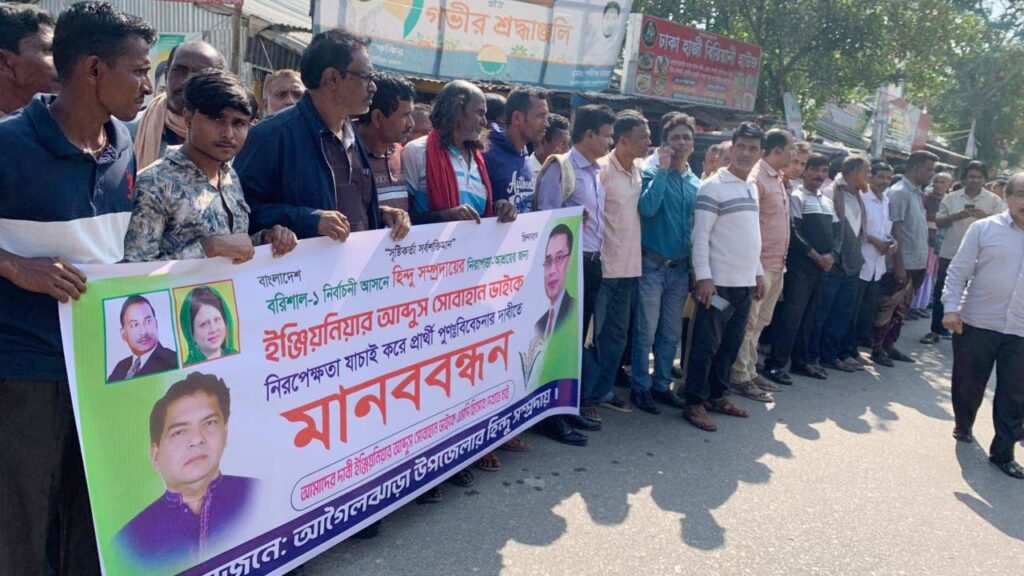 বরিশাল-১ (গৌরনদী-আগৈলঝাড়া) আসনে বিএনপির মনোনয়ন পরিবর্তনের দাবিতে মানববন্ধন ও বিক্ষোভ মিছিল করেছে হিন্দু সম্প্রদায়ের বিএনপির নেতাকর্মীরা।শুক্রবার সকাল সাড়ে ১০টায় আগৈলঝাড়ার সদরে হিন্দু সম্প্রদায়ের ব্যানারে ঘণ্টাব্যাপী এ মানববন্ধন ও বিক্ষোভ কর্মসূচি পালন করা হয়।এতে নির্বাচনি এলাকার বিএনপি ও তার অঙ্গসংগঠনের নেতাকর্মীসহ হিন্দু সম্প্রদায়ের শত শত নারী-পুরুষ অংশগ্রহণ করেন। এ সময় তারা ২০০১ সালের নির্বাচনের পর এ এলাকার হাজার হাজার হিন্দু নারী-পুরুষের ওপর হামলা ও নির্যাতনের অভিযোগ তোলেন।হিন্দু সম্প্রদায়ের নেতা নবীন সরকারের সভাপতিত্বে অনুষ্ঠিত মানববন্ধনে রবীন্দ্রনাথ গাইন বলেন, বিএনপির ঘোষিত খসড়া তালিকায় যাকে মনোনয়ন দেওয়া হয়েছে, তিনি বিগত ওয়ান-ইলেভেনের সময় জিয়াউর রহমানের পরিবার ও দলকে নিয়ে বিষোদগার করেন। এছাড়াও তিনি সংসদ সদস্য থাকাকালীন এ আসনে সবচেয়ে বেশি সংখ্যালঘু নির্যাতনের ঘটনা ঘটে।এ আসনে যাকে (জহির উদ্দিন স্বপন) মনোনয়ন দেওয়া হয়েছে তা বাতিল করে ইঞ্জিনিয়ার আবদুস সোবহানকে মনোনয়ন দেওয়ার দাবি করেন তারা।বিক্ষোভ সমাবেশে আগৈলঝাড়া উপজেলা বিএনপির সাবেক সাংগঠনিক সম্পাদক ও বর্তমান কমিটির যুগ্ম সম্পাদক ডা. মাহবুবুল ইসলামসহ বিএনপি ও অঙ্গসংগঠনের নেতাকর্মীরা উপস্থিত ছিলেন।